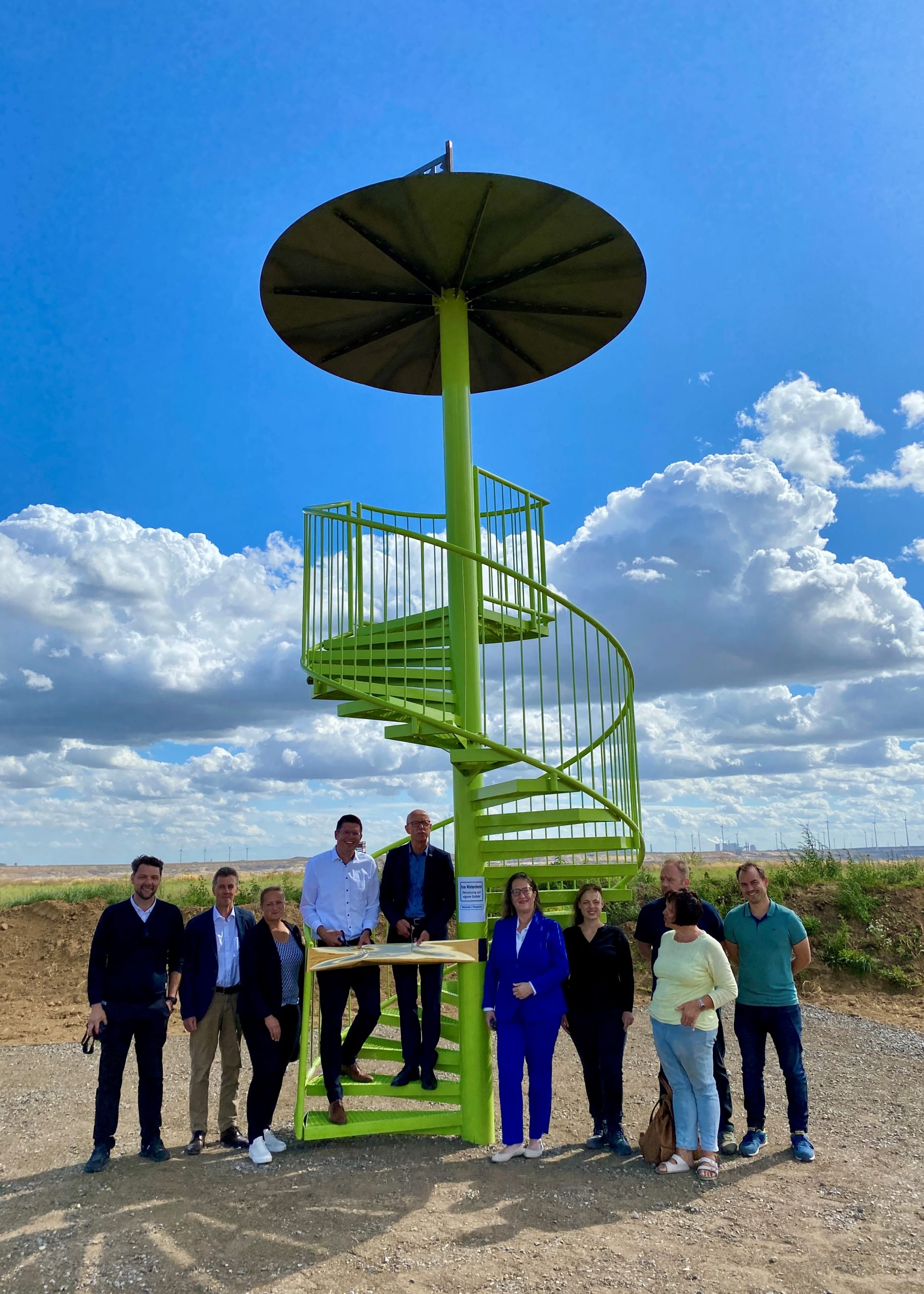 Erkelenz, 1. September 2025. Der Zweckverband LANDFOLGE Garzweiler hat einen neuen Aussichtspunkt in unmittelbarer Nähe des Tagebaus Garzweiler eröffnet. Er befindet sich südöstlich der Erkelenzer Ortschaft Keyenberg. In diesem Bereich wurden in den vergangenen Monaten durch die RWE Power AG bereits mehr als 17.000 Bäume gepflanzt und 25 Hektar Blühwiesen gesät. Verbandsvorsteher Harald Zillikens übergab den neuen Aussichtspunkt gemeinsam mit dem Erkelenzer Bürgermeister Stephan Muckel sowie dem Geschäftsführer des Zweckverbands Volker Mielchen und geladenen Gästen der Öffentlichkeit.