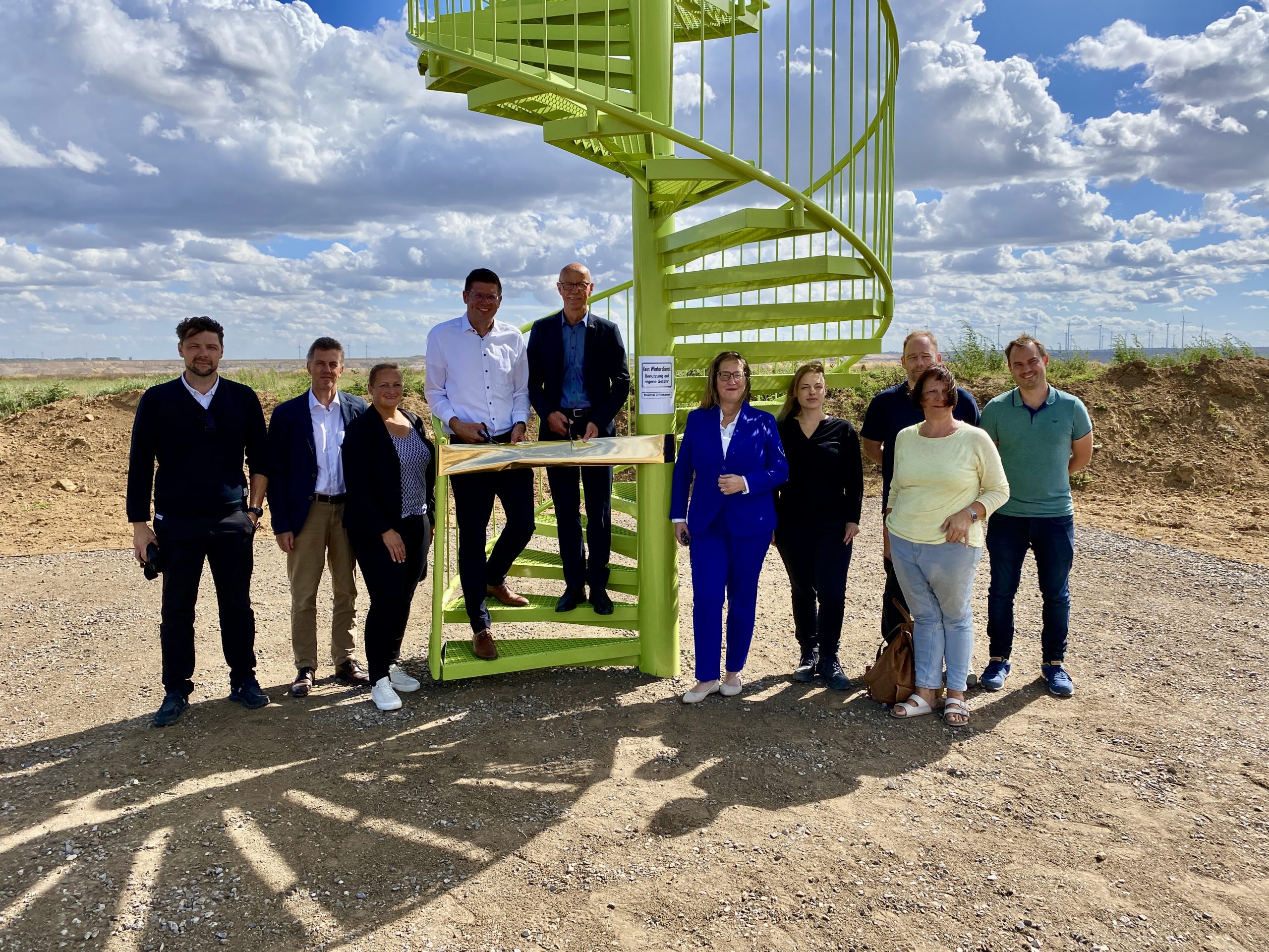 Der Zweckverband LANDFOLGE Garzweiler hat einen neuen Aussichtspunkt in unmittelbarer Nähe des Tagebaus Garzweiler eröffnet. Er befindet sich südöstlich der Erkelenzer Ortschaft Keyenberg. Verbandsvorsteher Harald Zillikens (Mitte rechts) übergab den neuen Aussichtspunkt gemeinsam mit dem Erkelenzer Bürgermeister Stephan Muckel (Mitte links) sowie dem Geschäftsführer des Zweckverbands Volker Mielchen (2. von links) und geladenen Gästen der Öffentlichkeit. Foto: Zweckverband LANDFOLGE Garzweiler