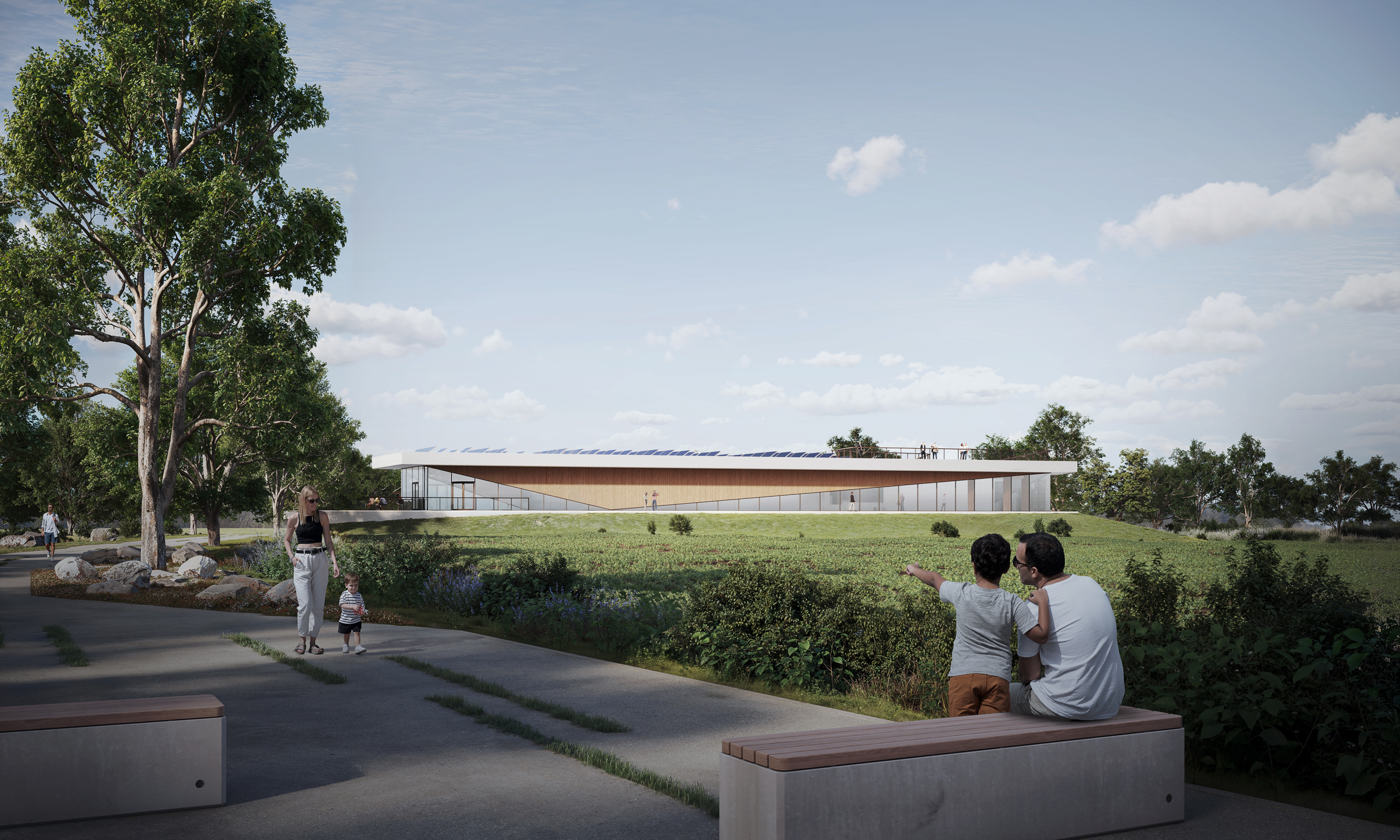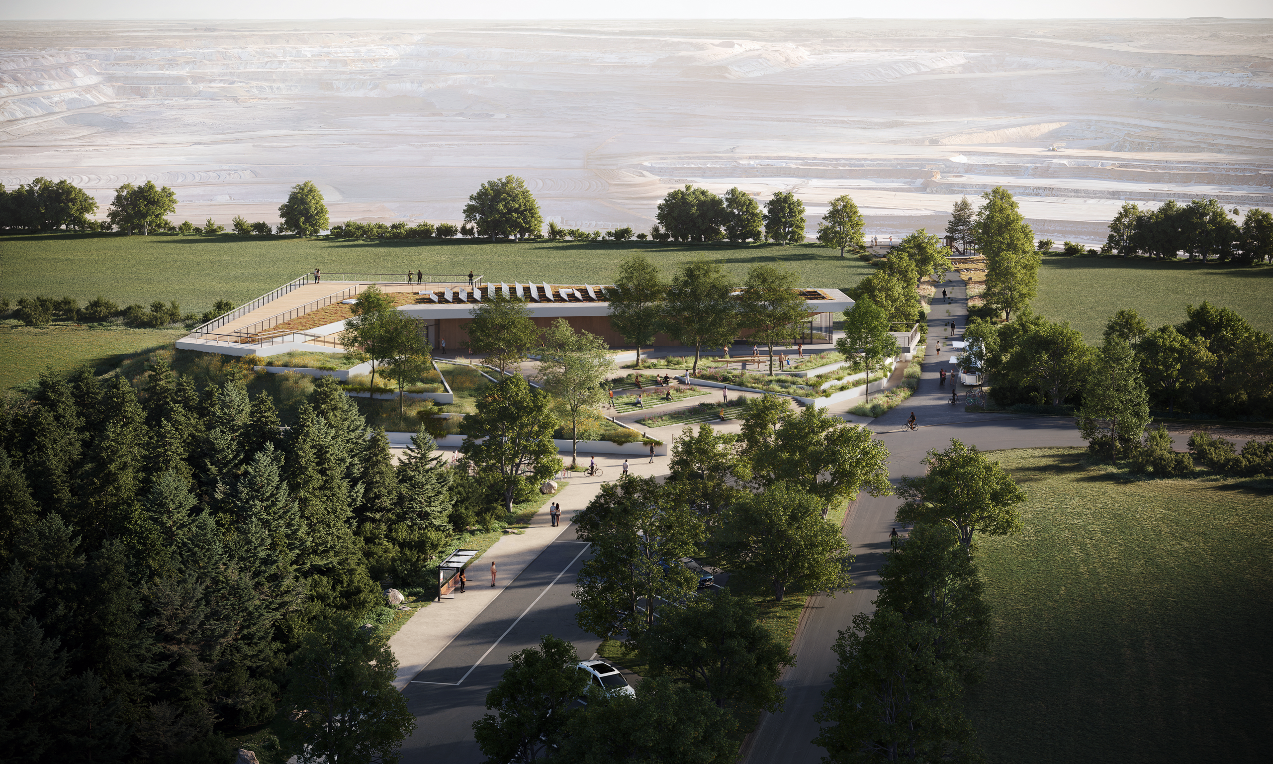 Das Besucherzentrum wird verbindendes Element zwischen aktivem Tagebau und dem Ort Holzweiler und ein idealer Einstiegspunkt für die Erkundung des Blau-Grünen Bandes Garzweiler werden, das derzeit rund um den Tagebau entsteht.