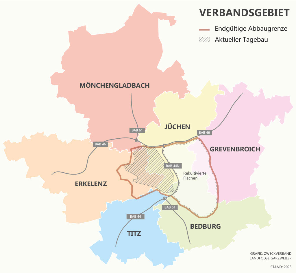 Neue Lebensräume schaffen ist das Leitmotiv des Zweckverbands LANDFOLGE Garzweiler. Als interkommunaler Verbund gestaltet er die Folgelandschaften und den Strukturwandel im direkten Umfeld des Braunkohlebergbaus. Das Verbandsgebiet umfasst sechs Anrainerkommunen des Tagebaus Garzweiler im Rheinischen Braunkohlerevier: Mönchengladbach, Erkelenz, Grevenbroich, Jüchen, Titz und Bedburg. Landschaftsgestaltung und -nutzung zählen ebenso zu den Themen im Zweckverband wie Landwirtschaft und Energie, Planung neuer Infrastruktur, gesellschaftliche Entwicklung, Städtebau und Wohnen sowie touristische Entwicklung.